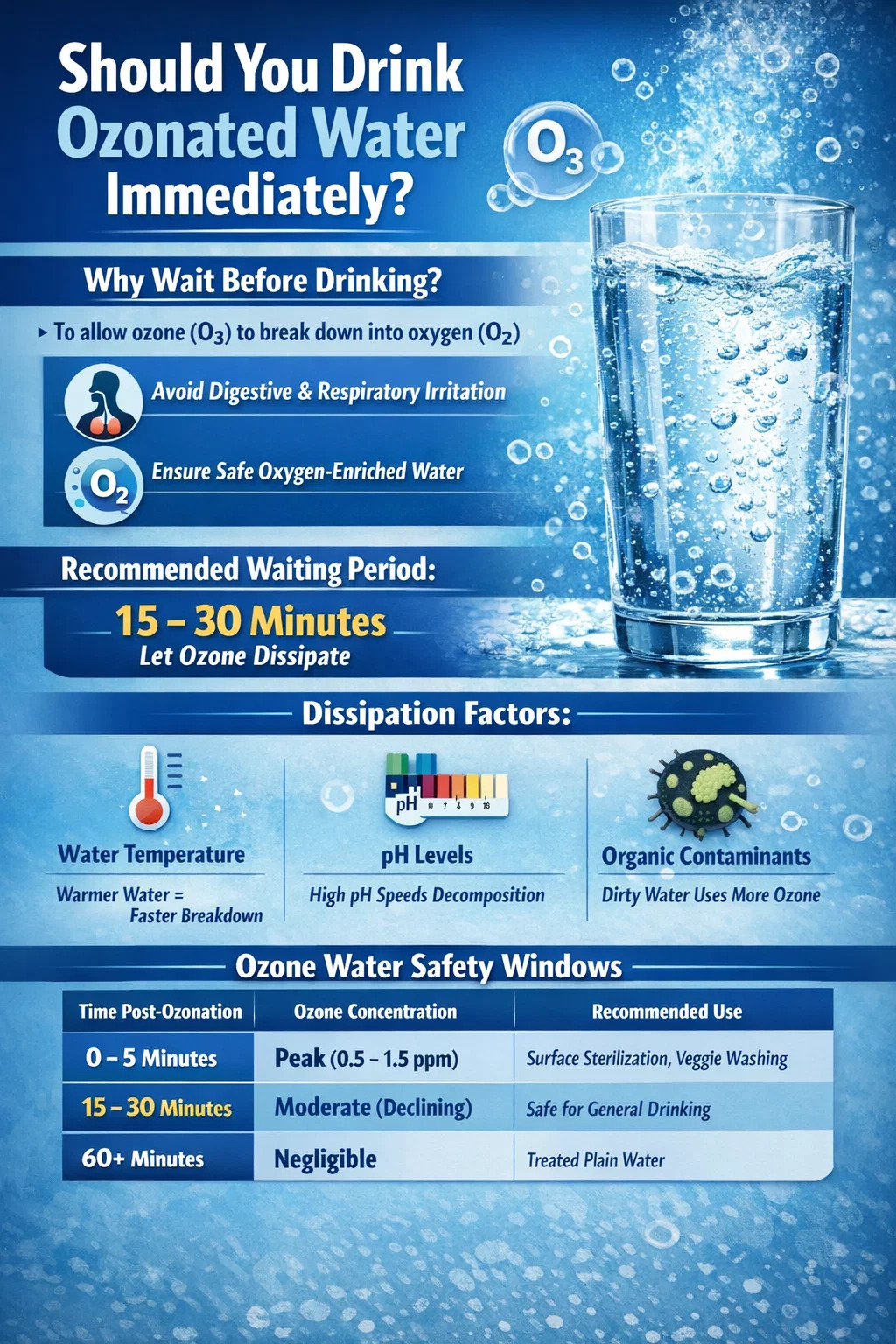 Die kurze Antwort lautet Nein, generell sollten Sie mindestens 15 bis 30 Minuten warten nach dem Ozonierungsprozess vor dem Trinken des Wassers. Während Ozonwasser ist außerordentlich wirksam als Desinfektionsmittel Wenn man es trinkt, während die Ozongaskonzentration ihren Höhepunkt erreicht, kann es aufgrund der Ausgasung restlicher Ozonmoleküle zu leichten Reizungen des Verdauungstrakts oder der Atemwege kommen.