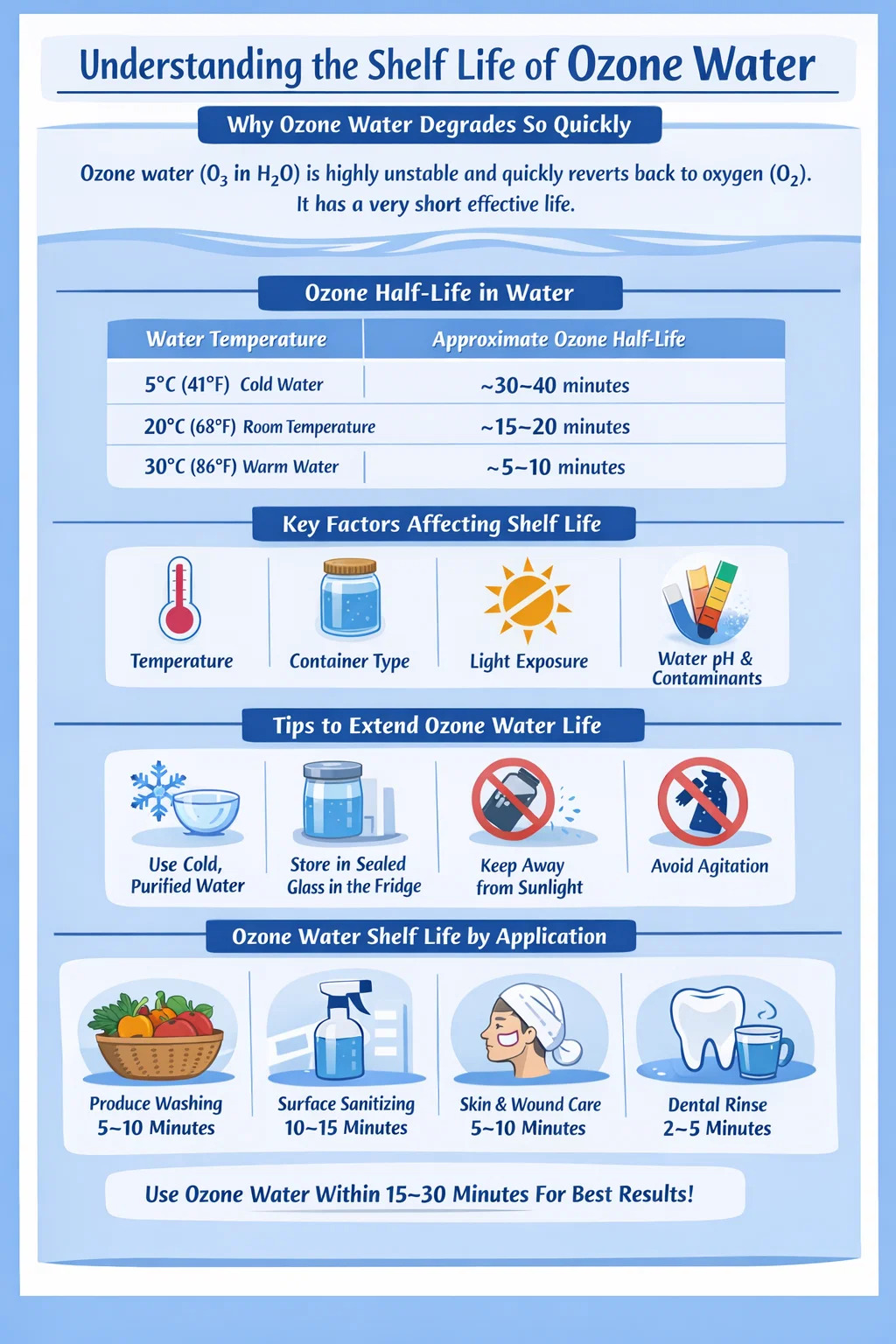 Wenn Sie Ozonwasser zum Desinfizieren von Oberflächen, zum Waschen von Produkten, zur Behandlung von Hauterkrankungen oder für andere Anwendungen verwenden, die auf seine Oxidationskraft angewiesen sind, müssen Sie es sofort nach der Erzeugung verwenden. Es aufzubewahren und zu hoffen, dass es noch Stunden später wirksam bleibt, ist ohne ganz bestimmte Bedingungen nicht realistisch.