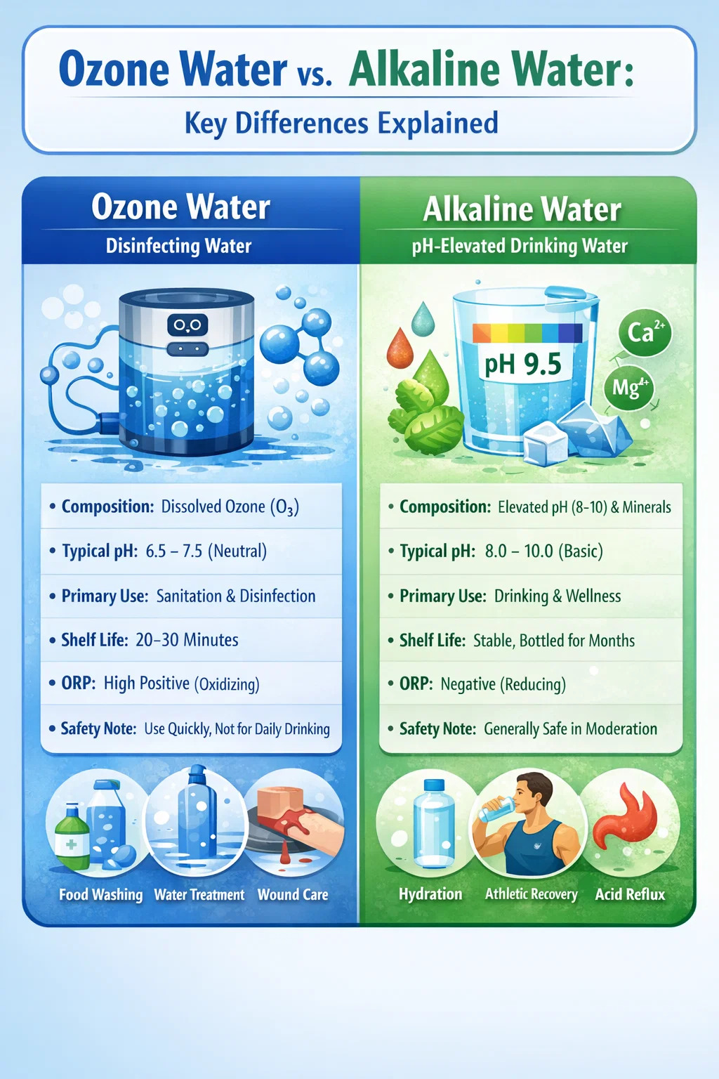 Nein, Ozonwasser und alkalisches Wasser sind nicht dasselbe. Sie unterscheiden sich grundlegend in ihrer Chemie, ihren Herstellungsmethoden, ihren gesundheitsbezogenen Angaben und ihren praktischen Anwendungen. Ozonwasser ist normales Wasser, das mit Ozongas (O₃) angereichert ist, was es zu einem starken Oxidations- und Desinfektionsmittel macht. Alkalisches Wasser hingegen ist Wasser mit einem pH-Wert über 7 – typischerweise zwischen 8 und 10 – der entweder durch Elektrolyse oder durch Zugabe alkalischer Mineralien erreicht wird. Die beiden Produkte zielen auf völlig unterschiedliche Probleme ab und wirken über völlig unterschiedliche Mechanismen.